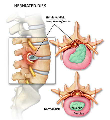 A herniated disc occurs when the inner core of the disc leaks out, or herniates, and affects an adjacent nerve root.